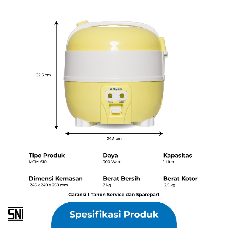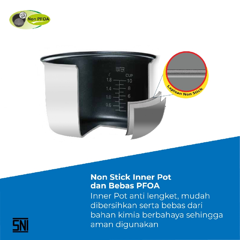 Merupakan penanak nasi dengan warna kuning cantik untuk dapur Anda. Memiliki fungsi 3 in 1 yaitu sebagai pemasak nasi, mengukus, dan menghangatkan makanan. Bagian inner pot yang terbuat dari material berkualitas tinggi menjadikannya anti lengket, tidak mudah tergores dan sangat mudah untuk dibersihkan. Memiliki 3 element pemanas dibagian atas, tengah dan bawah yang menjadikan nasi matang lebih sempurna dan tahan hangat lebih lama.