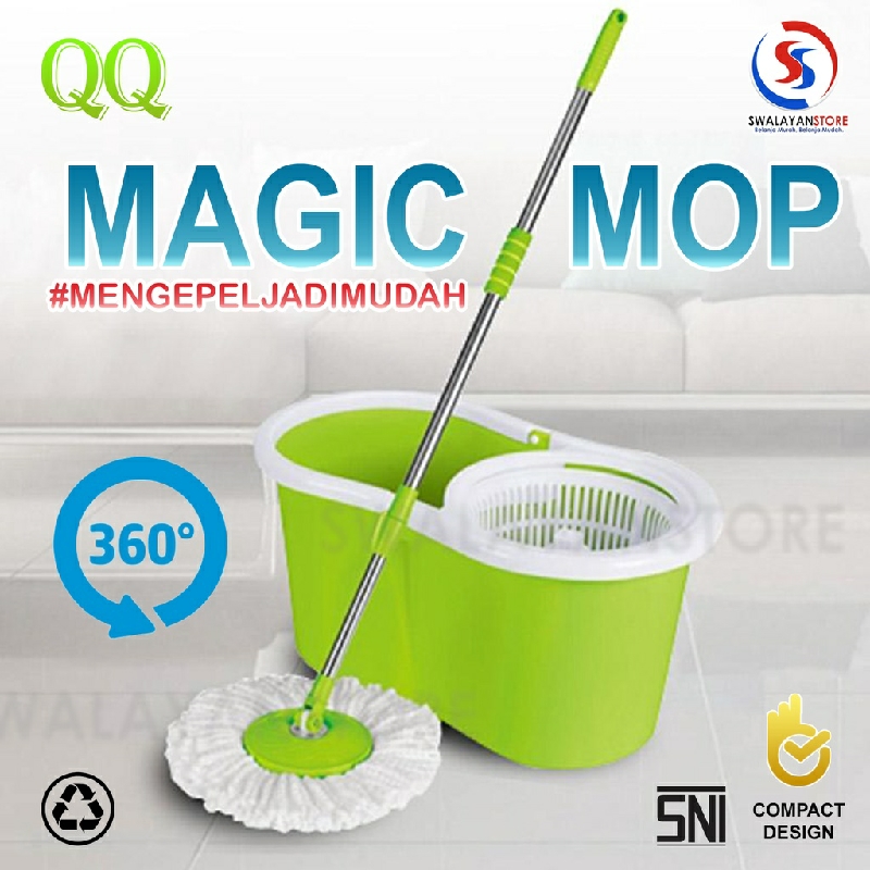 Q2 magic MOP / super mop adalah alat pel lantai yang dapat berputar 360 derajat, anda tidak perlu memeras air pel dengan tangan, cukup menekan tongkat pel pd tempatnya maka kain pel lantai akan terperas dengan sendirinya, praktis gak capek dan tidak mengotori tangan.