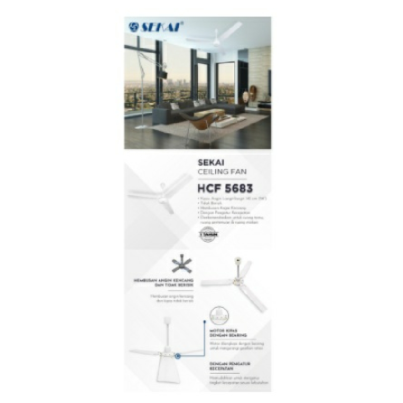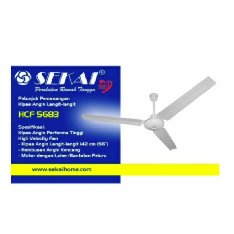 Kipas Angin Langit-langit SEKAI HCF 5683 adalah produk kipas angin langit-langit dengan ukuran 142 cm (56") di desain secara esklusif dan dilengkapi dengan kotak kendali pengatur kecepatan. Direkomendasikan untuk dipasang di ruang tamu, ruang pertemuan maupun ruang makan. Dilengkapi juga dengan sekring pengaman dari panas yang berlebihan.